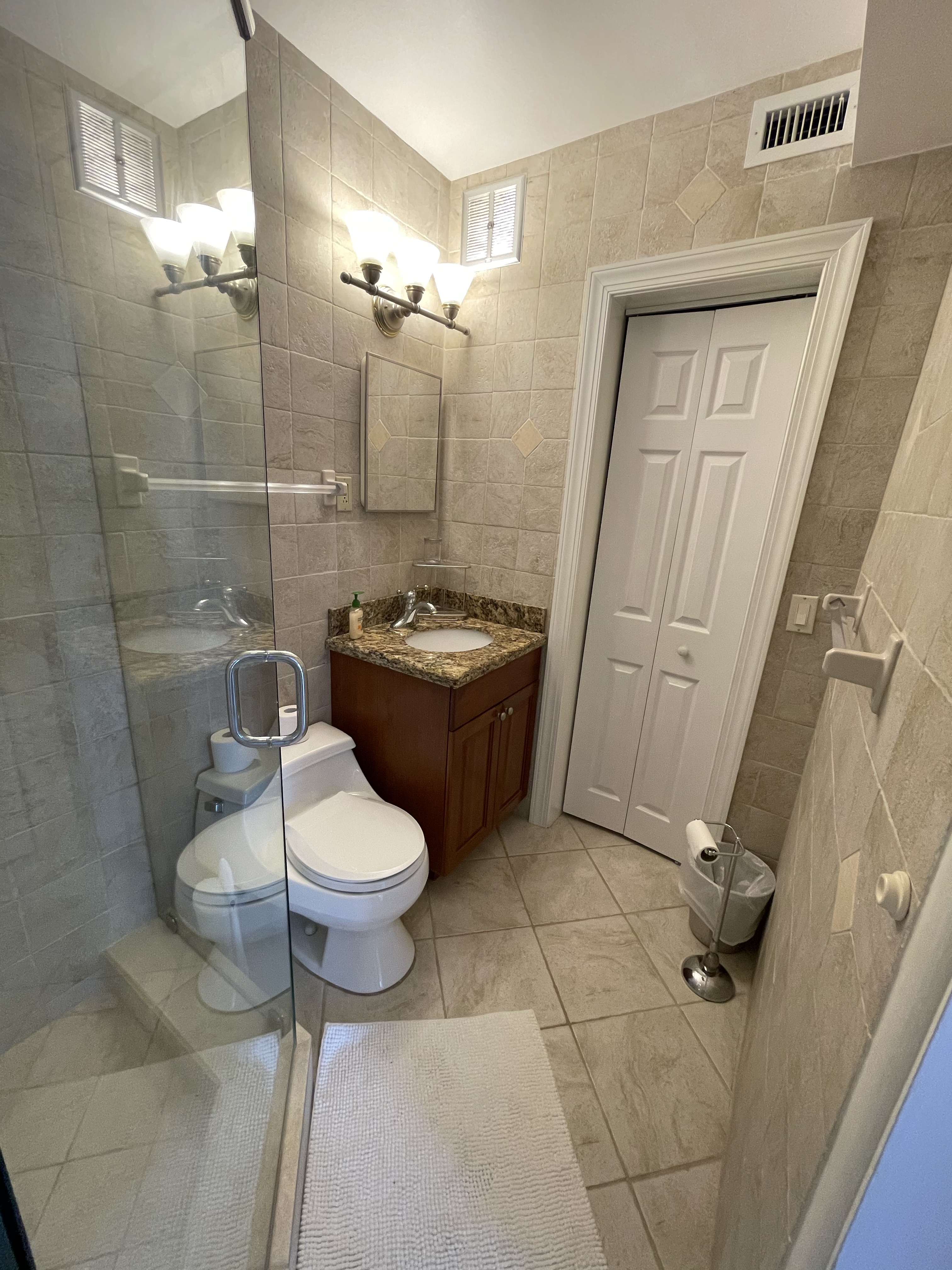 Master Bathroom: Single vanity, frameless shower, and linen closet